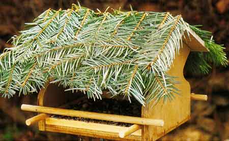Setzt nun das Dach auf und bedeckt es mit Teerpappe. Darauf könnt ihr Tannenzweige oder Baumrinde befestigen. Fertig ist die Futterstelle.