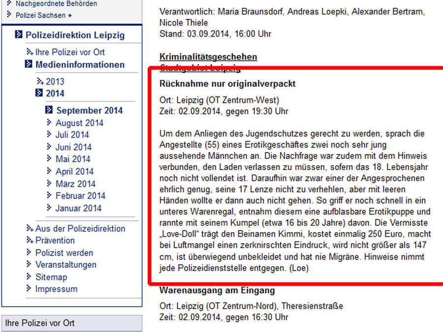 Es geht um eine Liebespuppe, die aus einem Sexshop gestohlen wurde. Um den Sachverhalt zu beschreiben, bemühte sich der Verfasser der Pressemeldung um sehr ungewöhnliche Formulierungen.