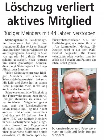 Die Steinhagener Feuerwehr hat eine ihrer tragenden Säulen verloren: Hauptbrandmeister Rüdiger Meinders ist am vergangenen Dienstag im Alter von gerade 44 Jahren überraschend gestorben. »Wir trauern um einen großartigen Kameraden«, sagt Steinhagens Löschzugführer Lutz Mescher.